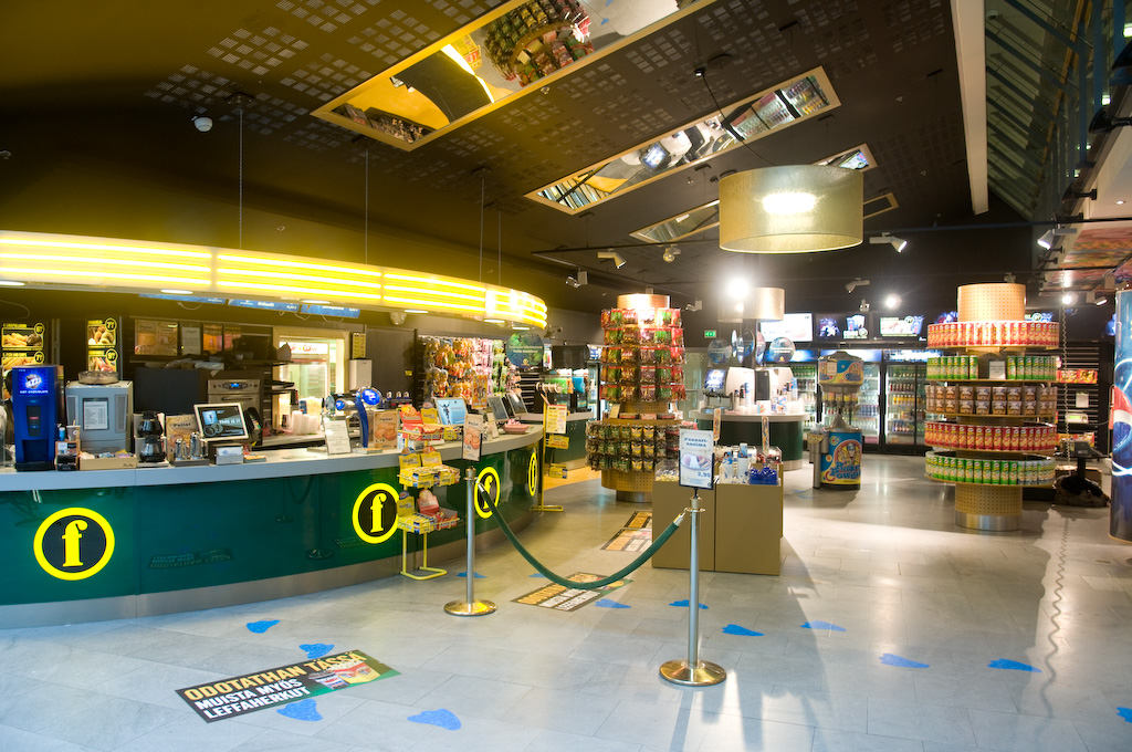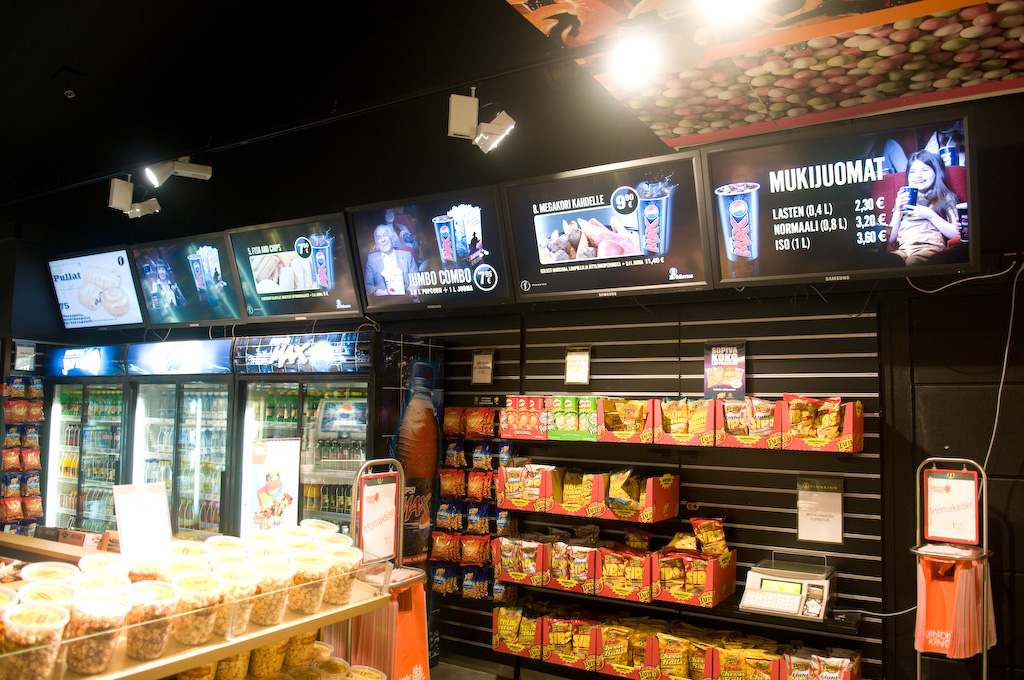 Suolaista tai makeaa, karkkia, sipsiä, pientä grillievästä, jäätelöä tai leivonnaisia. Limsaa, mehua, kahvia. Popcornia unohtamatta. Valinnan varaa on suorastaan ylitse pursuavasti. Siinä on tosiaan paikallaan, että kuuden suuren videonäytön patteri opastaa asiakkaita liikkuvalla, selkeällä ja värikkäällä tavallaan. Innostaen ja vaihtoehtoja tarjoten. Koko kioski remonttiin– Olemme kulkeneet myyntipäällikkömme Petri Laineen kanssa paljon erilaisilla messuilla ja muualla keräämässä näkemyksiä hyvästä asiakaspalveluympäristöstä, kertoo Kinopalatsi Helsingin teatteripäällikkö Henri Kurki. – Halusimme tarjota asiakkaille enemmän ja rakentaa todellisen herkkumaailman, joka tarjoaa jokaiselle jotakin.